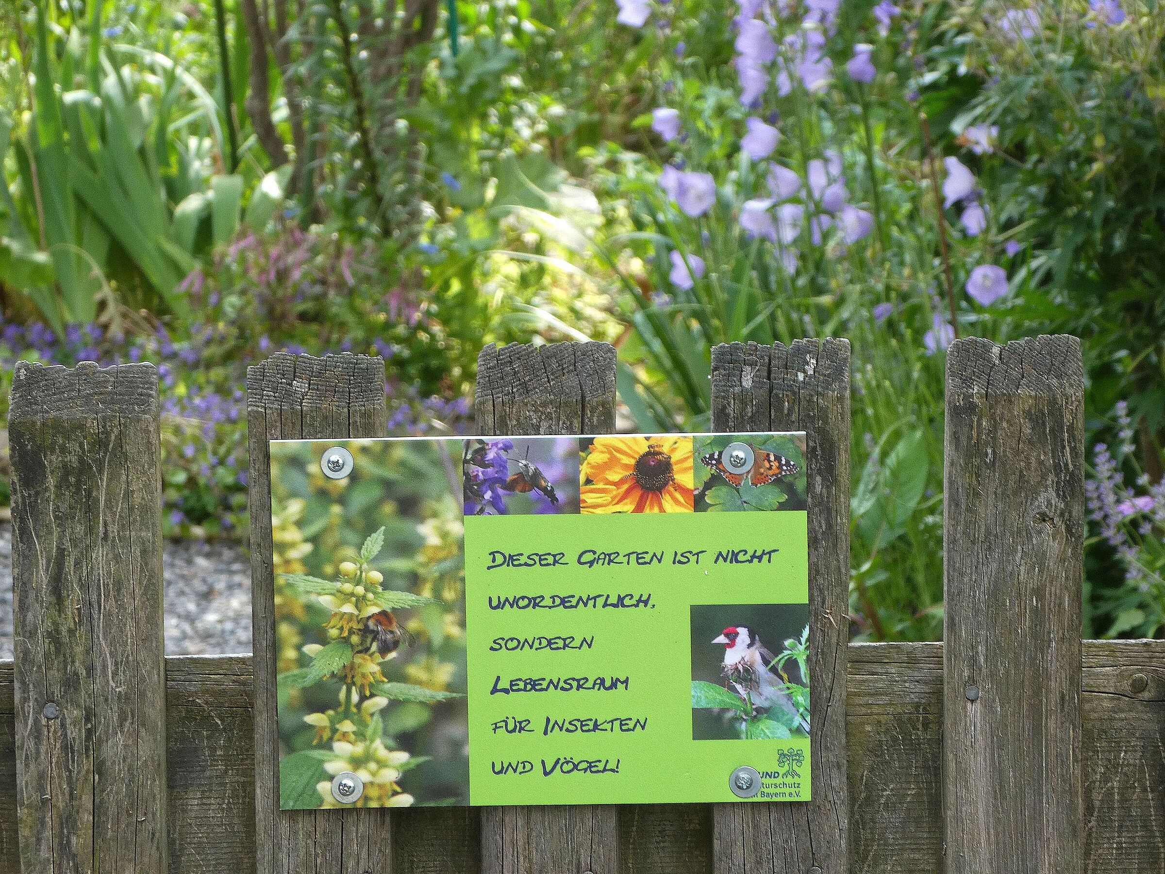 Die Gartenschilder des BN sollen aufklären und für Artenvielfalt und gewollte „Wildheit“ werben.