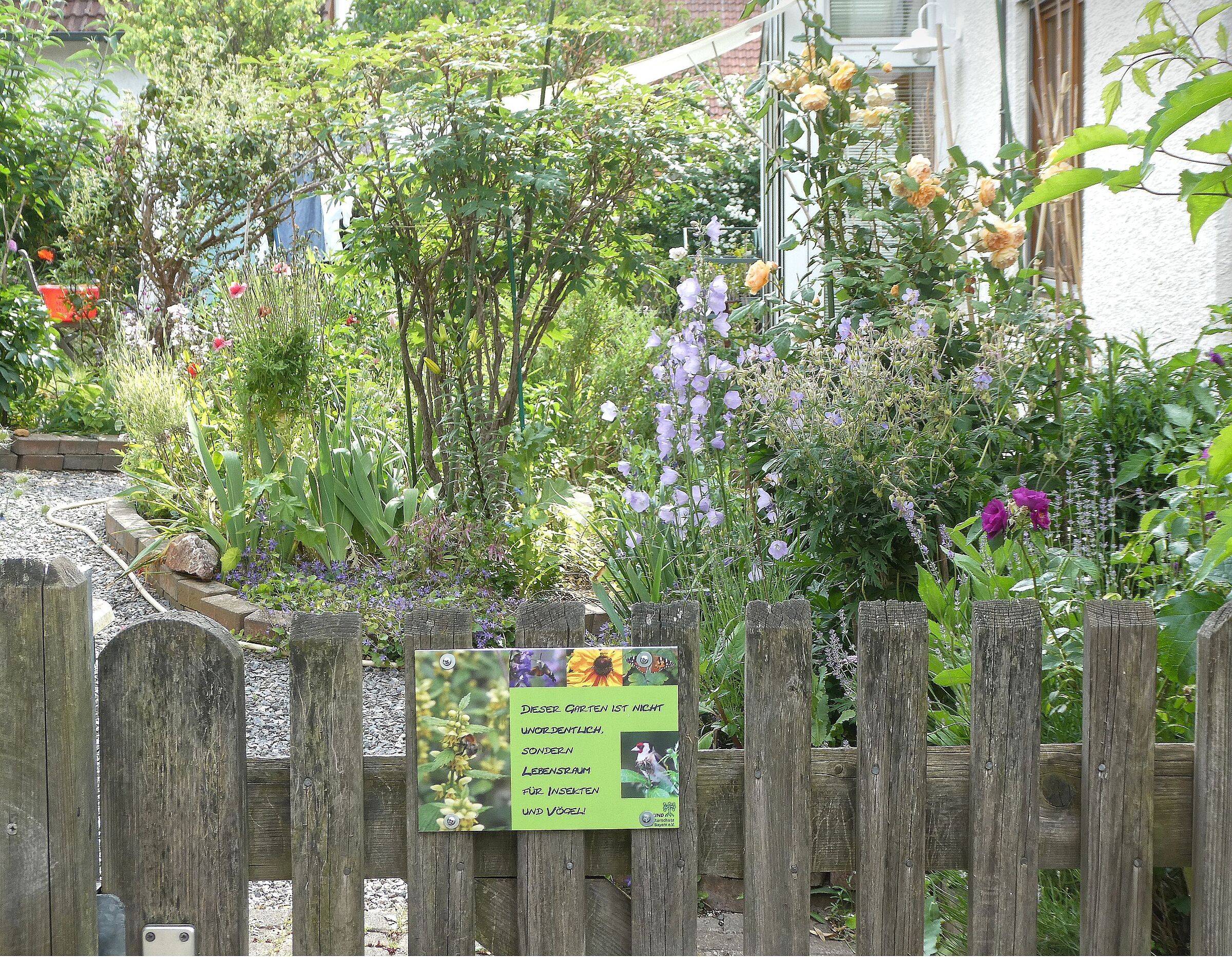 Wer seine Verantwortung für die Artenvielfalt auch vor der eigenen Haustüre wahrnimmt und auf englischen Rasen, Thujenhecke, Kirschlorbeer und Mähroboter verzichtet, hat die Möglichkeit, dies mit einem kleinen Schild das Bund-Naturschutz am Gartenzaun öffentlich zu machen. Das bunte Schild zeigt ordnungsliebende Nachbarn oder vorbeikommende Spaziergänger mit einem kleinen Augenzwinkern, dass es sich hier keineswegs um einen faulen, sondern vielmehr um einen naturliebenden Gärtner handelt. In diesen Gärten verbirgt sich die so wichtige Artenvielfallt, haben Insekten, Vögel, Igel und vielleicht auch manche Eidechse und Blindschleiche ein Zuhause.
