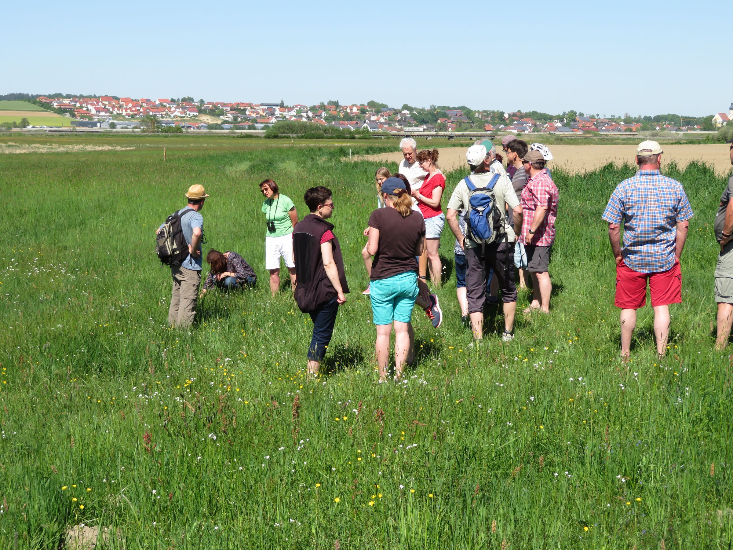 Die Wanderung durch die „Untere Au“ gehört nun schon seit vielen Jahren zum jährlichen Programm der Ortsgruppe Schierling. In diesem Jahr konnte die Vorsitzende Martina Kümpfbeck rund 25 Teilnehmer, darunter viele Kinder und Jugendliche, begrüßen. Die Führung leitete der Diplom-Biologe Robert Hierlmeier, der gleich zu Beginn die Bedeutung der Au als Wiesenbrütergebiet aufzeigte. Beim Spaziergang entlang der Wiesen kam schnell die Frage auf, warum manche Wiesen wunderschön bunt und andere nur grün sind. „Die Form der Bewirtschaftung macht den Unterschied“, erläuterte Hierlmeier, „denn mit häufigem Wiesenschnitt und intensiver Düngung kommen nur wenige Arten zurecht, während auf ungedüngten Wiesen der Aufwuchs schütter bleibt und dadurch auch niedrigwüchsige Kräuter und Wildblumen eine Chance haben“. Die Teilnehmer und vor allem die Kinder kannten bereits viele der Wiesenblumen, wie Hahnenfuß, Kuckucks-Lichtnelke, Wiesenknopf und Sauerampfer. Alle waren beeindruckt von der Blütenpracht und dem bunten Treiben der Wildbienen und Schmetterlinge. Die Ortgruppe ist sehr froh, dass viele Landwirte an Naturschutzprogrammen wie dem Vertragsnaturschutzprogramm teilnehmen und diese Artenvielfalt dadurch erst möglich machen. An der Laber konnten Prachtlibellen mit ihren blau schimmernden Flügeln beobachtet werden, die an dem naturnahen Flussabschnitt ihren Lebensraum haben.