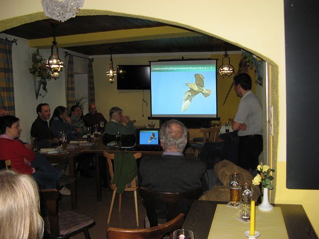 Auf großes Interesse stieß der Vortrag des Bund Naturschutz (BN) zum Thema Wiesenbrüter in der vergangenen Woche, zu dem Vorsitzende Martina Kümpfbeck ca. 20 Gäste begrüßen konnte. Als Referent des Abends konnte Dipl. Ing. Hartmut Schmid gewonnen werden, der für den Landschaftspflegeverband Regensburg als Gebietsbetreuer tätig ist und durch diese Tätigkeit bereits zahlreiche Erfahrungen in Sachen Wiesenbrüterschutz sammeln konnte. Zum Einstieg brachte Schmid den Zuhörern die zur Gruppe der Wiesenbrüter gehörenden Arten näher wie beispielsweise den Großen Brachvogel, als Leitart der Wiesenbrüter einer ihrer bekanntesten Vertreter. Weitere Arten, die auch im Schierlinger Raum noch vorkommen, sind etwa Kiebitz oder Bekassine. Anhand von Karten zeigte Schmid auf, wo und in welcher Anzahl diese Vogelarten in Bayern noch zu finden sind. Hier wurde deren Seltenheit bzw. der bayernweit bei fast allen Arten eingetretene drastische Bestandesrückgang v. a. der letzten Jahre deutlich. Inzwischen sind fast alle Wiesenbrüterarten auf der Roten Liste als stark gefährdet oder als vom Aussterben bedroht eingestuft. Als Grund für den drastischen Rückgang der Bestände gilt die Verschlechterung oder Zerstörung ihres Lebensraums. So brauchen Wiesenbrüter wie der Große Brachvogel große, zusammenhängende, feuchte Grünlandgebiete mit offenem Landschaftscharakter. Wichtig sind auch kleinflächig vorhandene Vernässungen, wo reichlich Nahrung zu finden ist, Wiesen mit nicht zu dichter Vegetation, so dass die nestflüchtenden Jungen sich in der Vegetation bewegen können, sowie ein kleinteiliger Wechsel aus gemähten Bereichen zur Nahrungssuche und ungemähten Wiesen, in die sich die Jungen bei Gefahr zurückziehen können. Diese Bedingungen sind durch die immer intensivere Grünlandbewirtschaftung (starker Düngereinsatz, frühere, häufigere Mahd mit immer größeren und schnelleren Maschinen auf immer größeren Bewirtschaftungseinheiten) aber immer seltener gegeben. Die Wiesenbrüter schaffen es so weder schnell genug vor den Landmaschinen zu flüchten noch finden sie nach großflächigen Mäharbeiten genügend Unterschlupf und Nahrung, so Hartmut Schmid. Aber auch ständige Störungen während der Brutzeit stellen ein großes Problem dar, denn die meisten Wiesenbrüter reagieren sehr empfindlich auf Störungen. Spaziergänger im Brutgebiet, insbesondere mit Hunden, ob mit oder ohne Leine, führen bei den scheuen Vögeln angeborenerweise zu Angst und Stress, was sich negativ auf den Bruterfolg auswirkt.