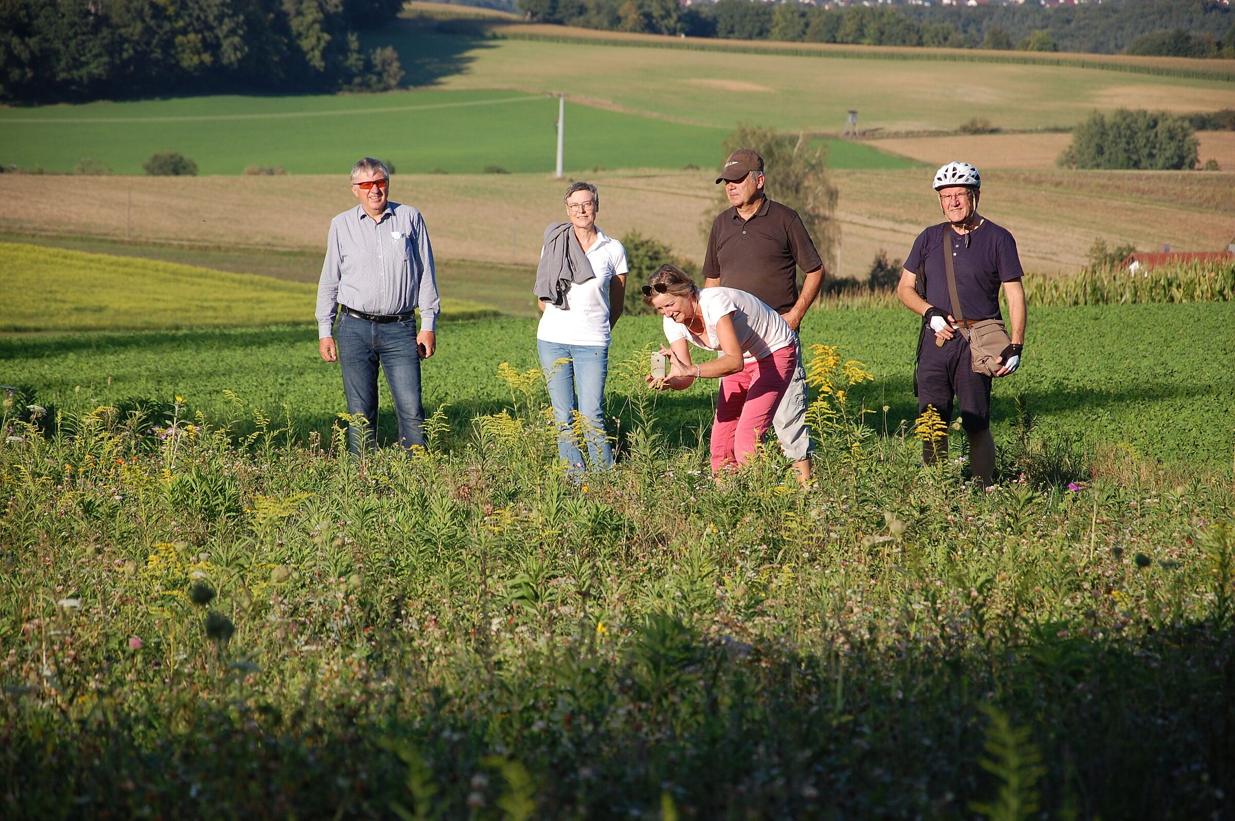 Dem Aufruf im Mitteilungsblatt folgten rund 20 Bürgerinnen und Bürger: Mit einer Spende von 50 Euro konnte jeweils eine Fläche von 100 m2 für 5 Jahre als Blühfläche „gepachtet“ werden. Schwieriger war die Suche nach Landwirten, die bereit waren, ihre Ackerflächen für fünf Jahre als Blühfläche bereit zu stellen. Schließlich gelang es uns, mit Herrn Karl einen engagierten Landwirt zu finden, der zwei Flächen – eine bei Kohlstadt und eine im Ortsbereich Viehhausen – zu den Bedingungen zur Verfügung stellte. Herr Sedlmeier vom Landschaftspflegeverband stand uns beratend zur Seite und konnte das richtige Saatgut besorgen. Die Trockenheit im Frühjahr sorgte für einen verspäteten Wachstumsbeginn. So stand die Fläche bei Kohlstadt noch in voller Blühte, als wir im September, coronabedingt in kleiner Gruppe, die Blühflächen besuchten.
