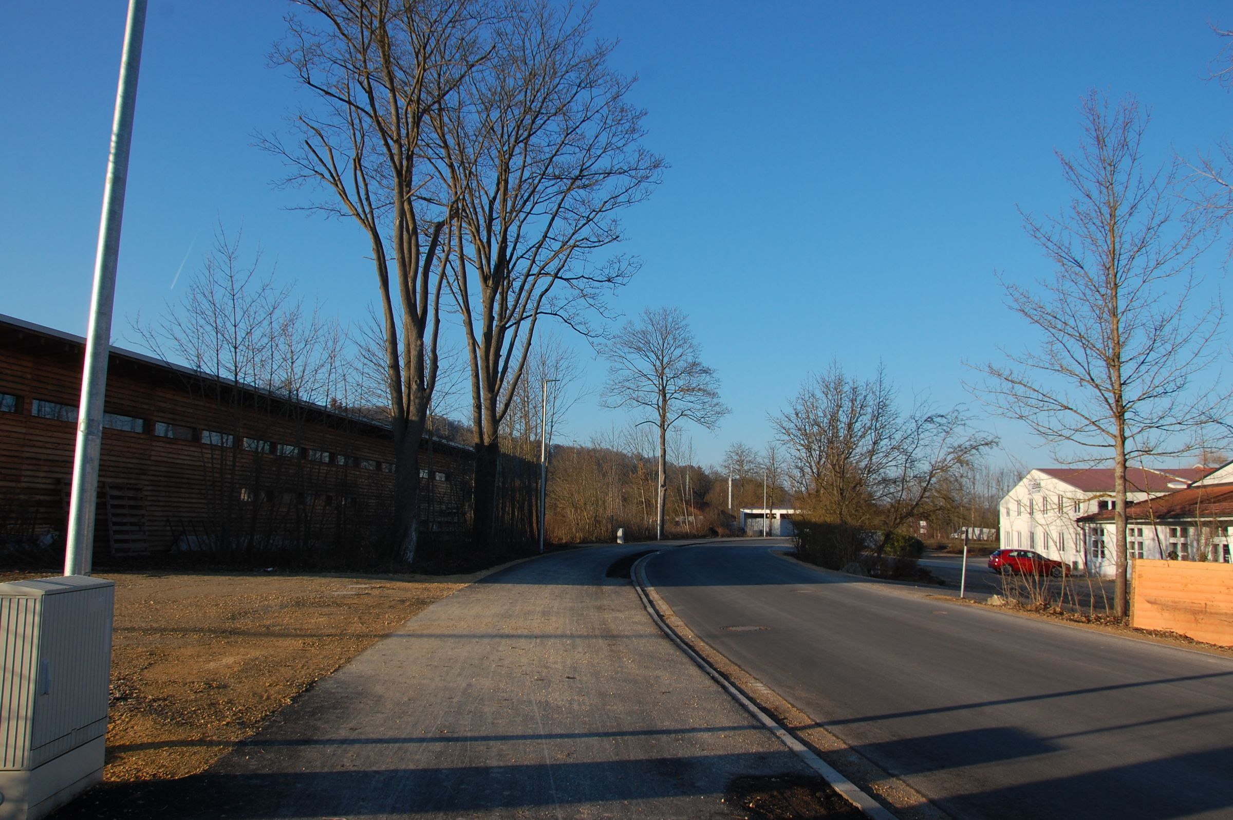 Der erste Bauabschnitt reicht bis über den Wertstoffhof hinaus ortseinwärts und verschonte die beiden stattlichen Bäume bei der Pizzeria. Der restliche Teil der Bahnhofstraße soll nicht unmittelbar, aber zu einem späteren Zeitpunkt ausgebaut werden. Wir hoffen und werden uns dafür einsetzen, dass der Ausbau moderat erfolgt und nicht zu weiterem größerem Baumverlust führt. Insbesondere gibt es eine Reihe von Eschen am zum Bahndamm hin grenzenden Straßenrand, die eher selten vorkommen. Wir sprechen uns dafür aus, dass hier nur ein Gehsteig gebaut wird, der Radverkehr auf der Straße fließt und durch Schutzstreifen auf der Fahrbahn gekennzeichnet wird. Zudem sollte dieser Teil der Straße als Radfahrerstraße ausgewiesen werden, d.h., der Radverkehr hat dann vor dem motorisierten Verkehr Vorrang.