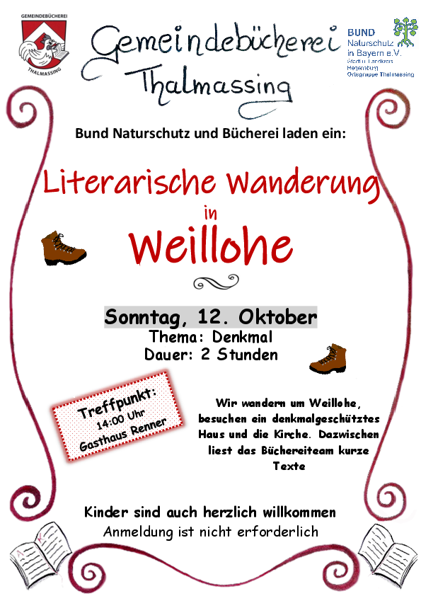 Wir laden am Sonntag, 12. Oktober um 14:00 Uhr zur literarischen Wanderung in Weillohe zusammen mit der Bücherei Thalmassing ein.