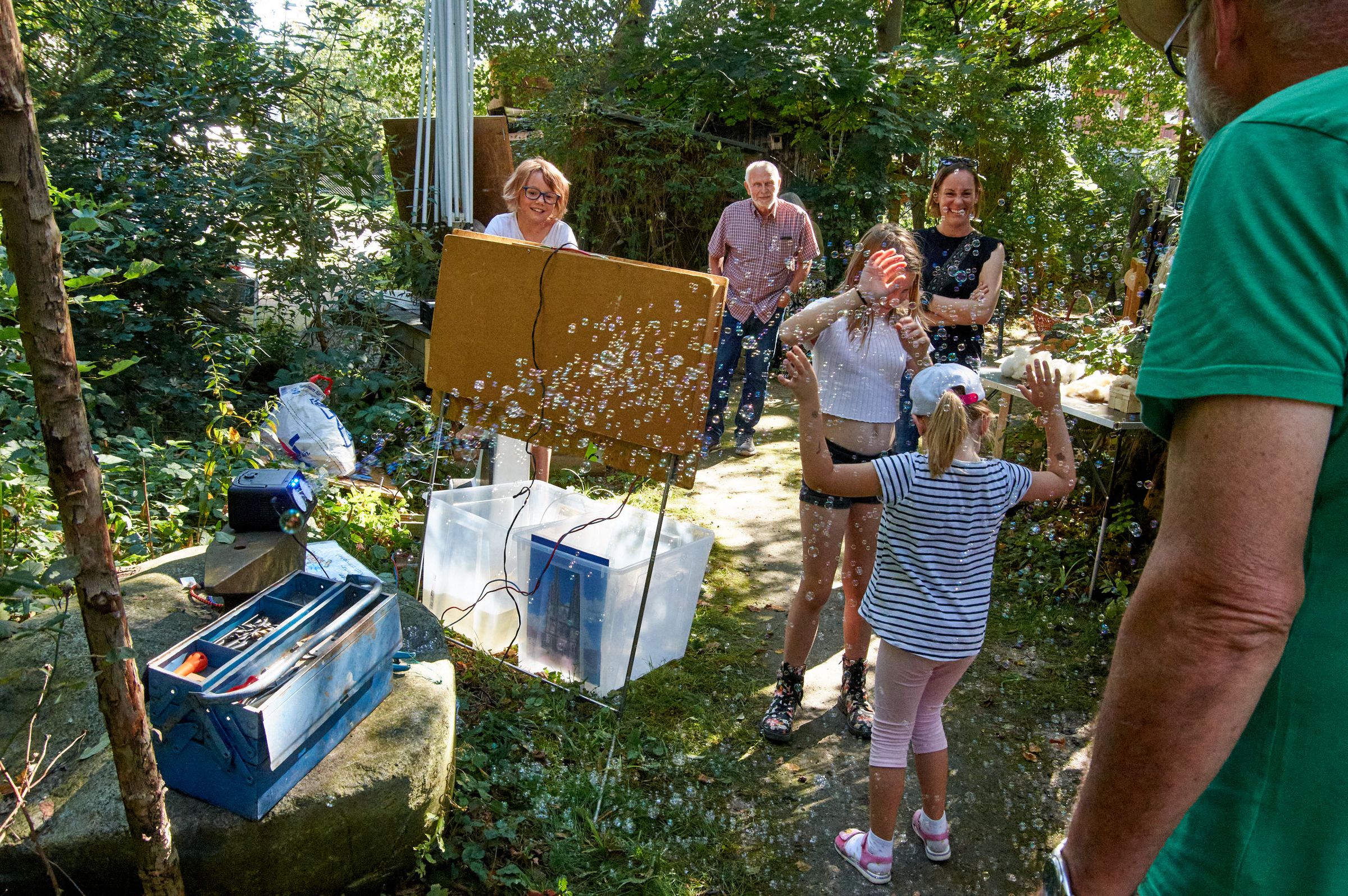Treten Sie ein für die Energiewende war das Motto für das Energierad. Neu war, dass mit dem Energierad eine Luftblasenmaschine angetrieben wurde. Es war wunderbar den Kindern zuzuschauen, wie sie mit den Seifenblasen tanzten.