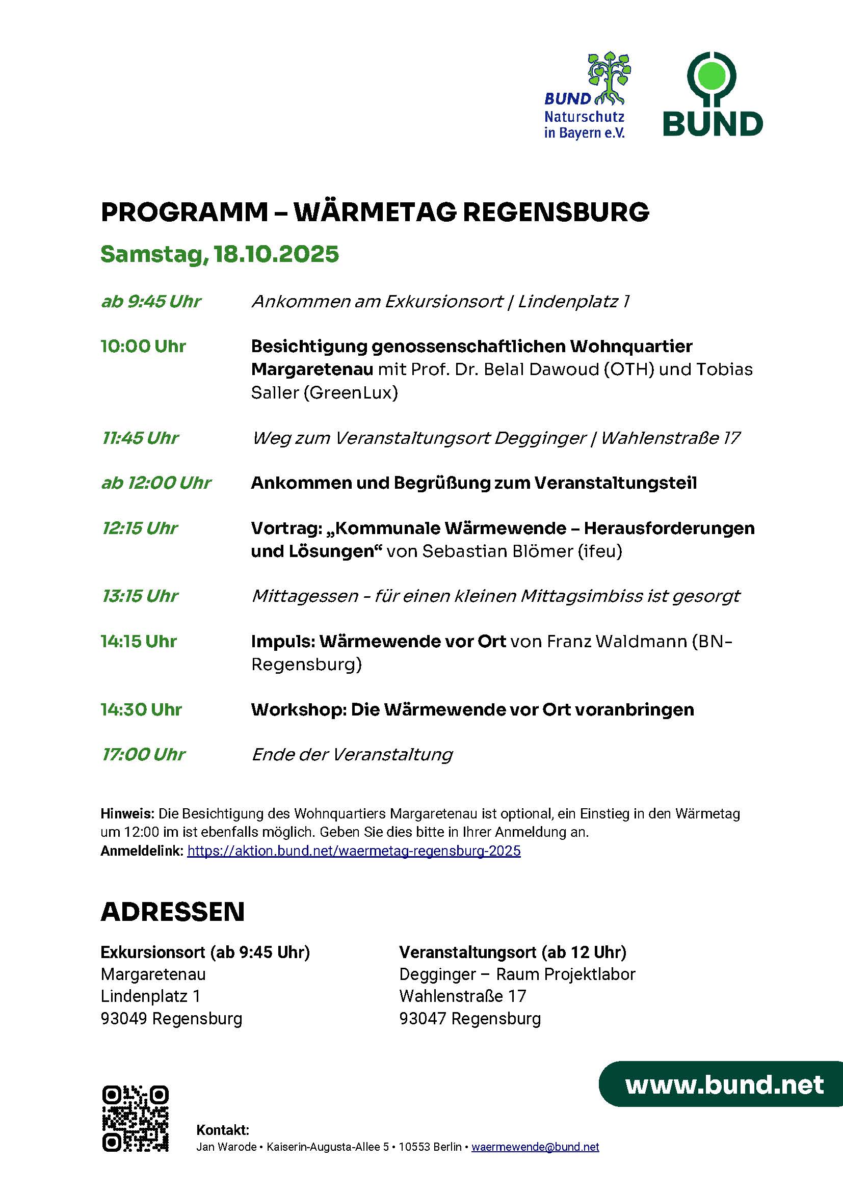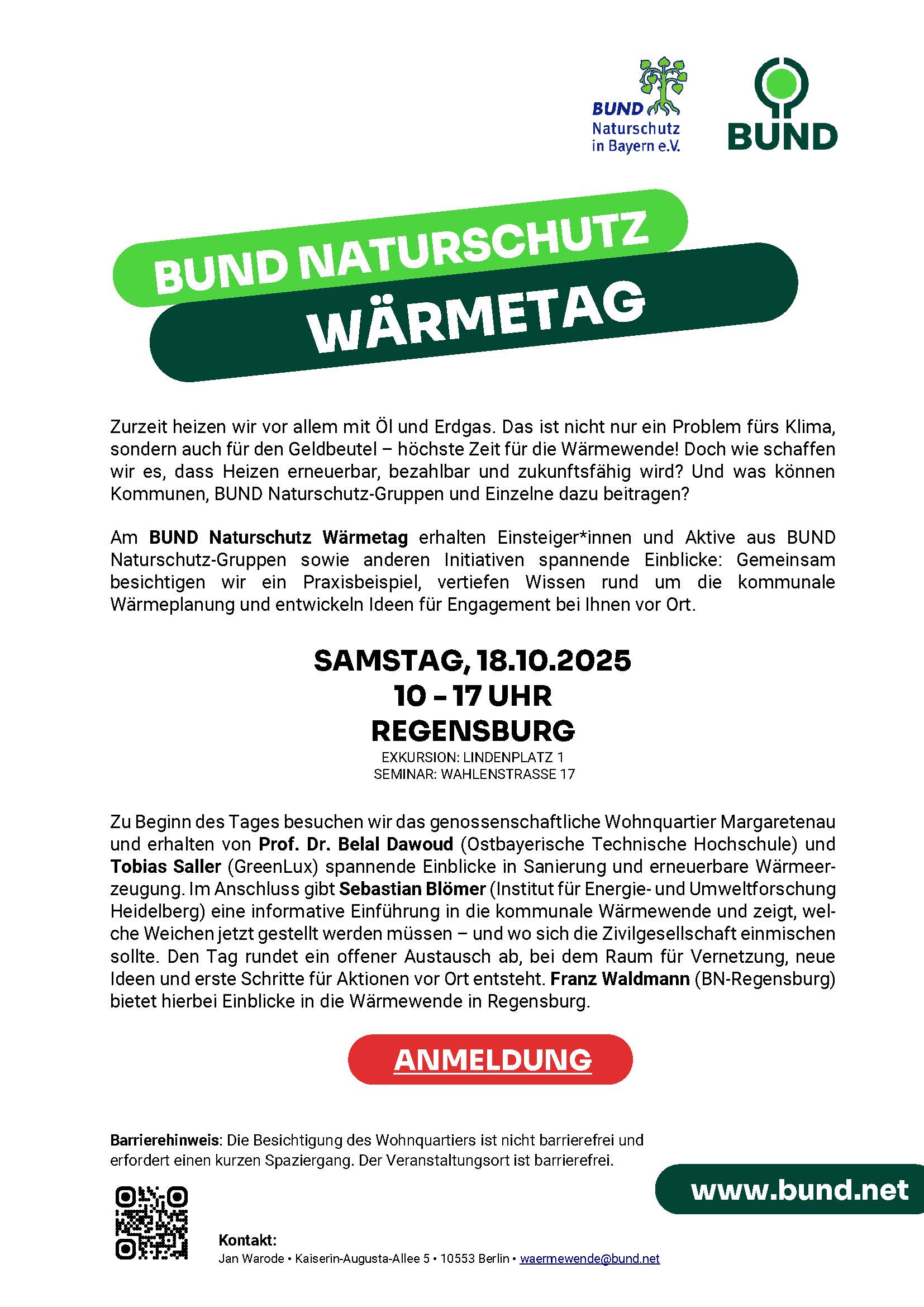 Beim BN/BUND-Wärmetag am 18.10.2025 von 10 bis 17 Uhr in Regensburg gehen wir diesen und weiteren Fragen nach. Eingeladen sind Einsteiger*innen und Aktive aus BN/BUND-Gruppen und anderen Organisationen, die Lust haben, erste Einblicke ins Thema zu erhalten oder die Wärmewende bei sich vor Ort (weiter) voranzutreiben. Es ist kein Vorwissen erforderlich.